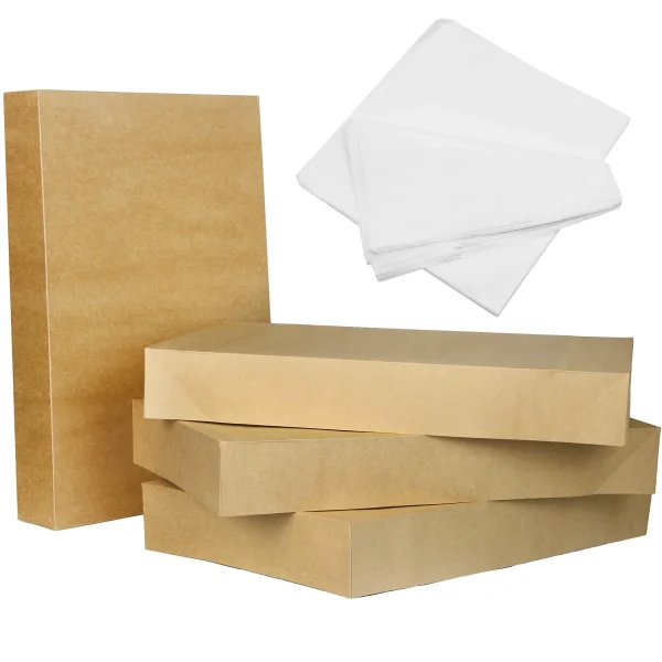 โข Cardboard gift boxes with lids include 12 pieces of Brown Kraft Gift Boxes measuring 17โณ x 11โณ x 2.4โณ with 12 sheets of tissue paper.