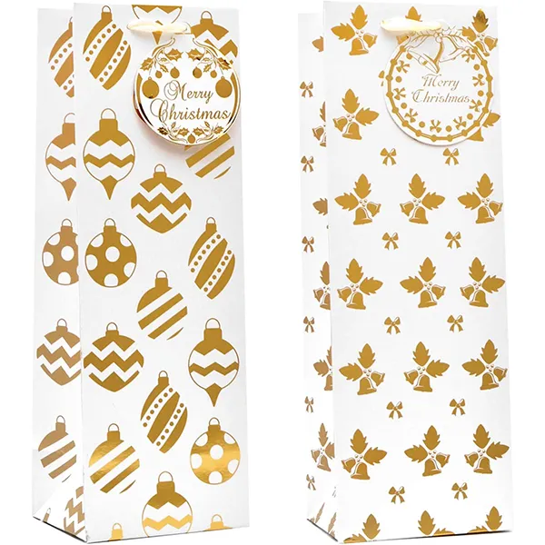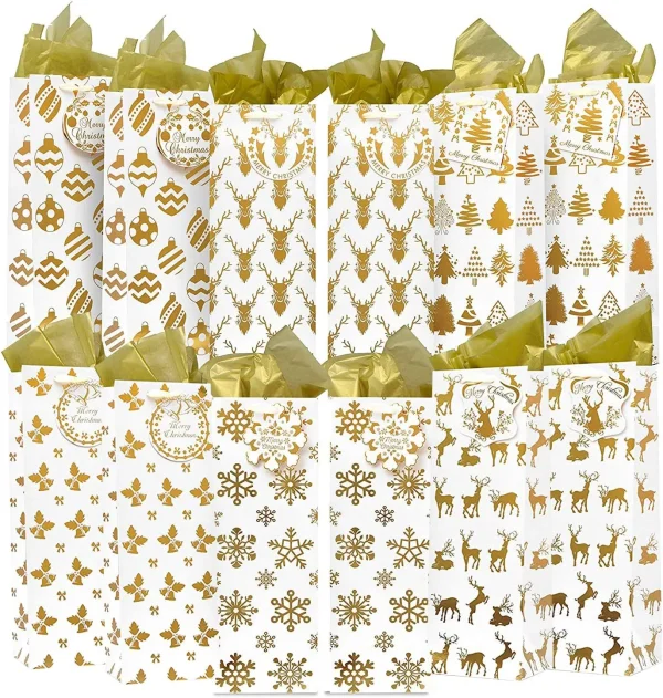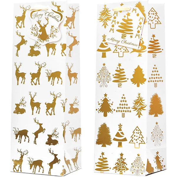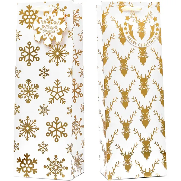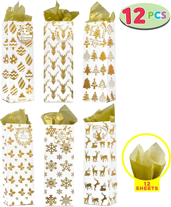 • Wine bottle gift bag includes 6 Fancy Gold Metallic Foil Christmas Design in Snowflake, Christmas Tree, Deer Heads, Reindeer, and Jingle Bells Ornaments Styles (2 Bags of Each Design) and 12 Sheets of Golden Tissue Paper.