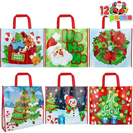 β’ Our goody bags include 12 pcs of large Christmas tote bags with 6 fancy designs and measure 14 x 13.8 x 8 inches each.