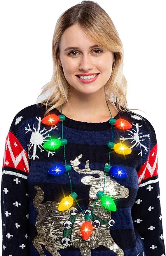 โข Our light-LED wearable necklace is for everyone, Great for a holiday outfit, ugly holiday sweater, and ugly Christmas t-shirt accessory. Our necklace makes great ornaments for office, holiday-themed parties, seasonal events, Mardi Gras, jolly goody bags, or even fun novelty gifts.