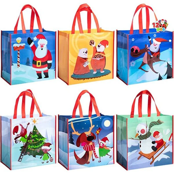 • These Reusable Grocery Bags with Handles include 12 Pcs Christmas Themed tote bags that come in 6 designs such as Santa, Xmas tree, and Elk. Each bag is 14 x 13.5 x 8 inches.