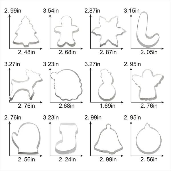 • Christmas cookie cutter set includes 12 pcs all you need, gingerbread man, Santa Claus, snowman, reindeer, angel, snowflake, Christmas tree, Christmas socks, glove, candy cane, ornament, and bell. The cookie cutters’ sizes range from 1.69 inches to 3.54 inches which are decent sizes and great details, you could make some nice sugar cookies with this set.