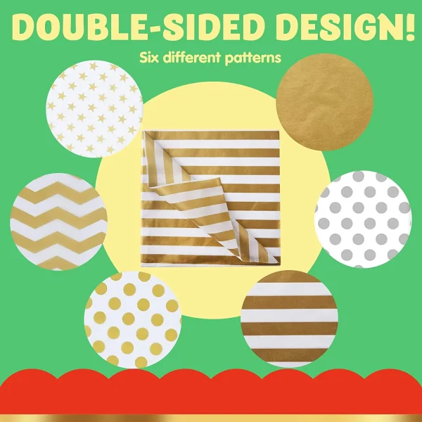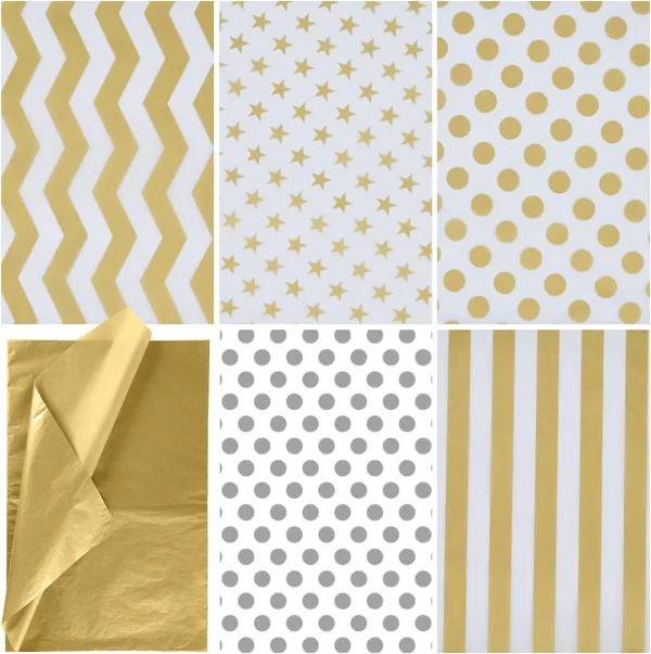 Our Christmas tissue paper 6 Sheets each 20β³ x 20β³ inches, wrapped in a plastic bag with a Christmas ribbon, is great to use as gift wrap, party decorations, and more. They are foil metallic foiled tissue paper with gold zigzags, golden stars, golden dots, golden striped, and silver polka dots. This tissue wrapping paper will not tear when folded or cut. Perfect for craft projects or other decorative purposes such as wrapping presents for present wrapping, arranging cookies on the table at home or office, and Weddings!