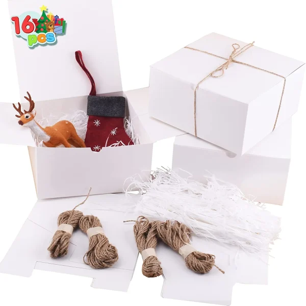 β’ White Christmas gift boxes are composed of 16 pcs boxes with 132-foot long Twine and 0.2-ounce Raffia. The white box is measured at 4*8*8β.
