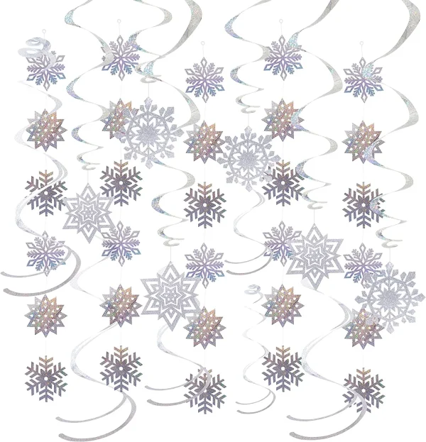 Super Quality. Snowflakes Strings are Made from Foil. The Swirls Hanging Snowflakes Cutouts are Made of PVC Materials.