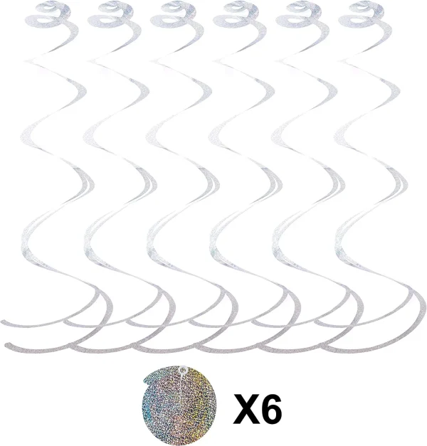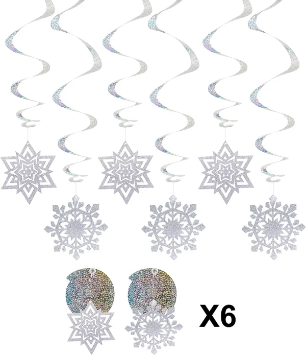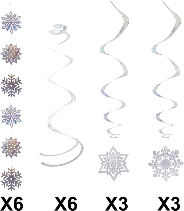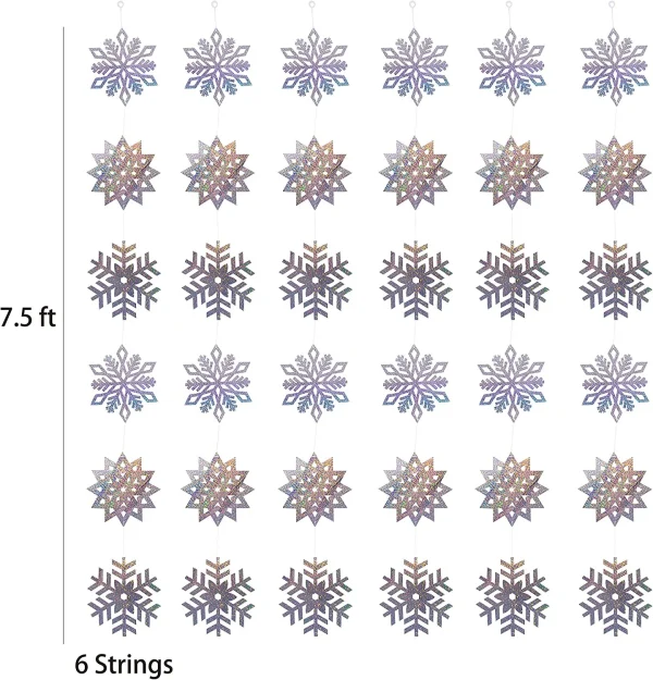 • This Christmas Snowflake Hanging String Decorations Set Includes 6 Pieces of Snowflakes Strings, Each String has 6 Foil Snowflake in 3 Designs; 6 Pieces of Double-ending Swirls, and 6 Pieces of PVC Snowflakes Cutouts.