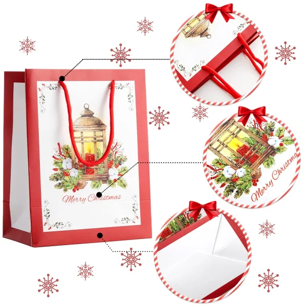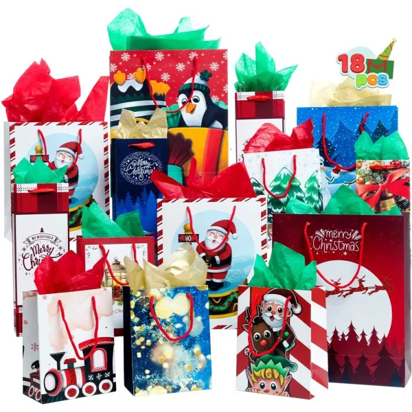β’ These Christmas goodie bag includes 18 Pcs Holiday Giving Christmas Postcard Bags with 12 Designs. These comes with the following Sizes, Large (15 x 12x 5 inches), Medium (12 x 10 x 4.8 inches), Small (9 x 7 x 4 inches) and Wine Bag (14 x 5 x 3 inches)