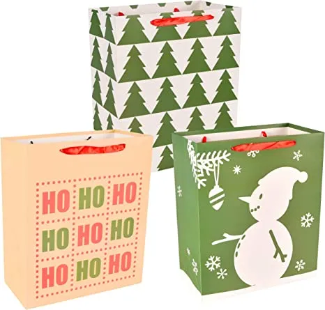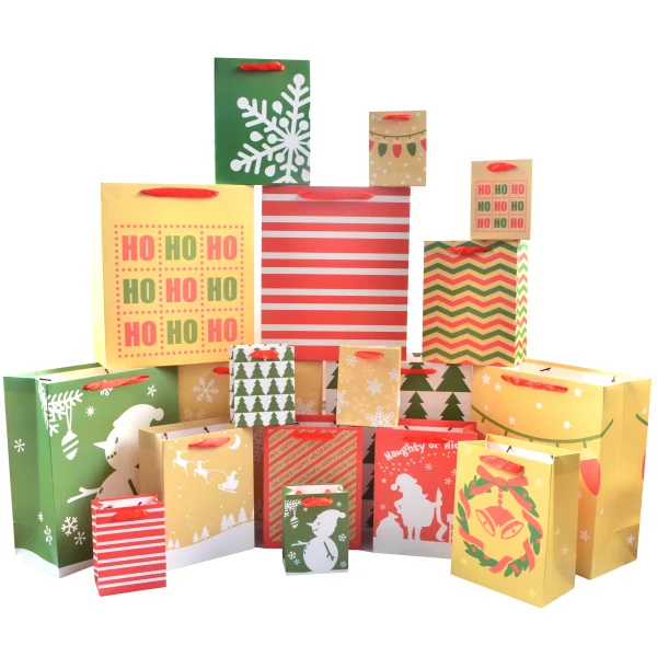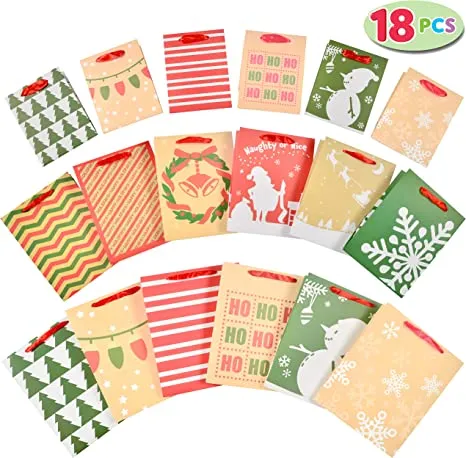 • Christmas gift bags includes 18 Assorted Sizes Xmas Creamy Kraft Style Gift Bags in 12 Different Unique Designs.