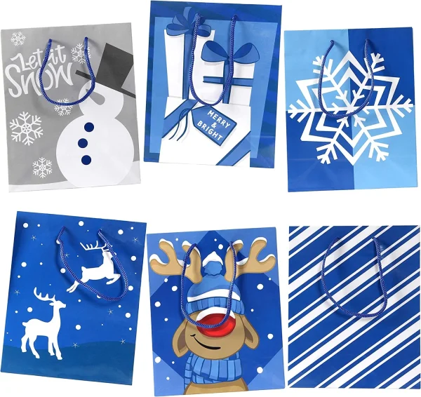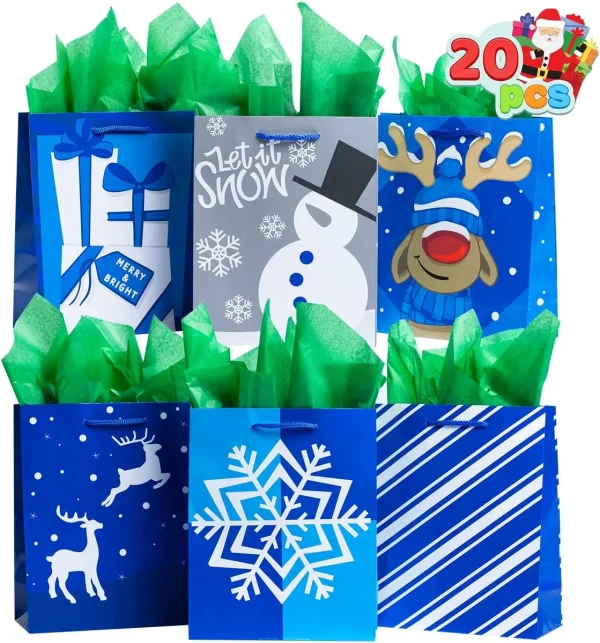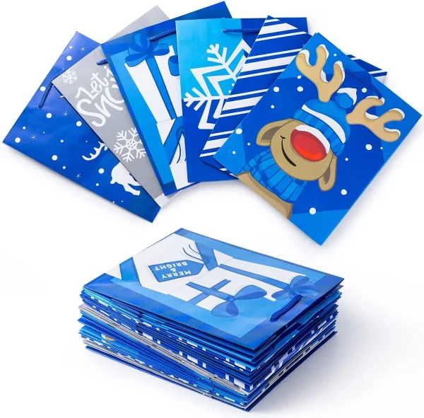 • Blue paper gift bags with handles include 20 pieces of paper gift bags with 6 designs in size: 7.3*3.4*8.9’’