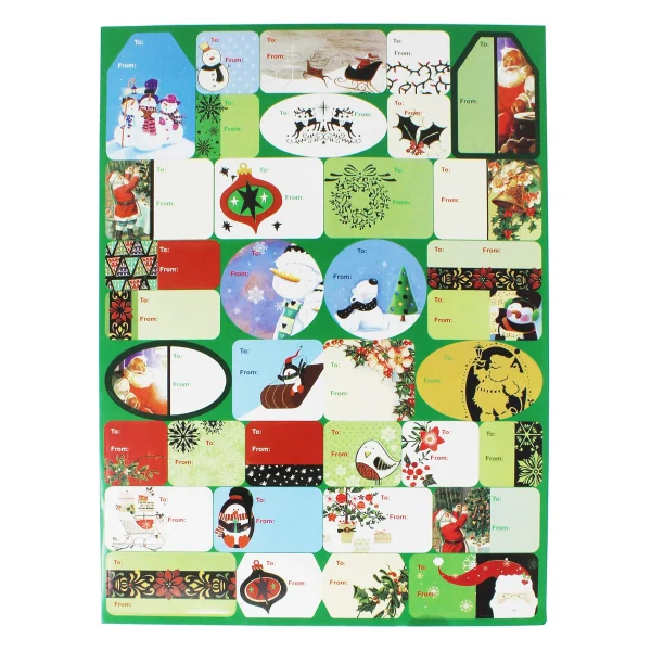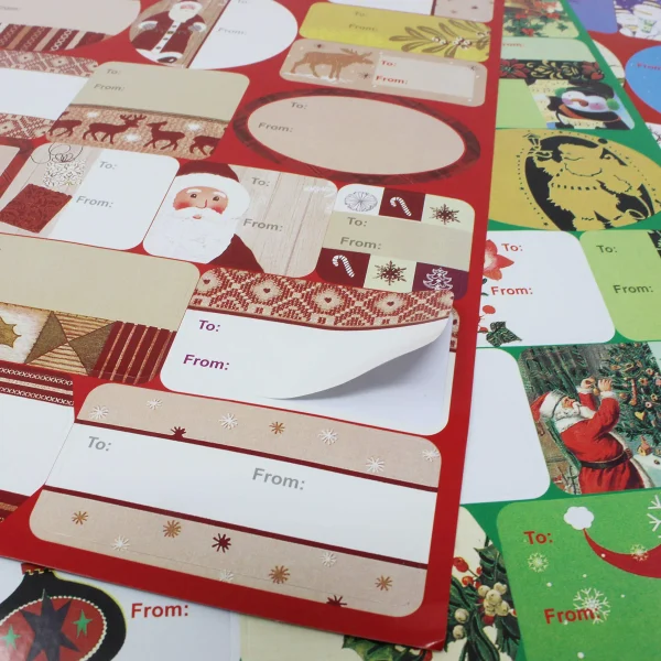 โข Self adhesive stickers come with 216 Pcs Assorted Self Adhesive Stickers in 6 Sheets of Different Designs of Santa, Xmas Tree Snowmen Deer, etc. Each Sheet has 36 Designs of Gift Tag Stickers.