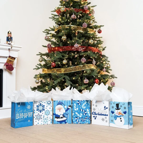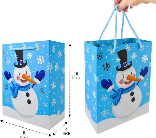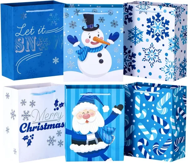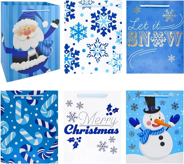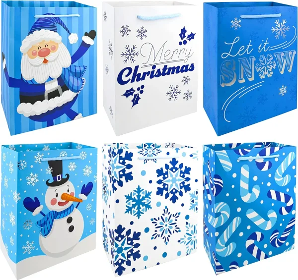 โข Christmas gift bags includes 24 pcs blue-themed paper gift bags which come with 6 Christmas playful characters & patterns style designs. Each gift bag measures 8 x 10 x 4 inches.