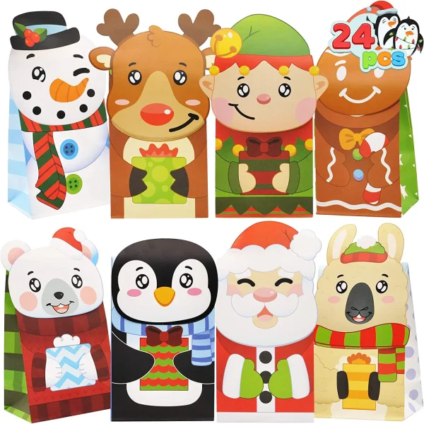 β’ These Christmas Paper Treat Bags include 24 pieces of high-quality holiday Treat & Gift Bags that measure 5.1 x 3.25 x 9.8 inch. It comes with 8 Festive Holiday Designs.