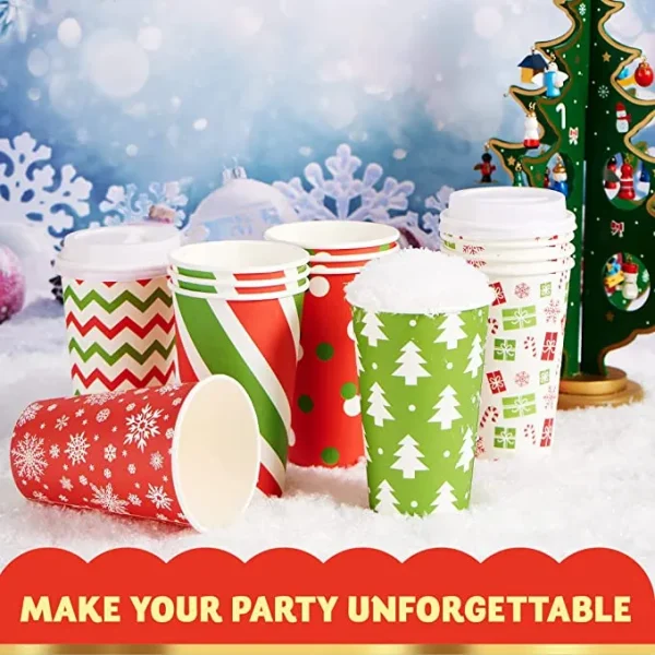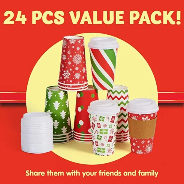 • Our Christmas disposable coffee cups with lids includes 24 pieces of Christmas paper cups measuring 16 oz in 6 assorted Holiday designs.
