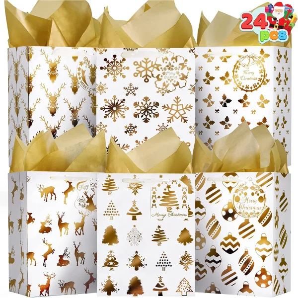 β’ Foil Christmas gift bags includes 24 individual gift bags with 6 designs. Each bag is 4X8X10 inches. The gift bags are decorated with foil-imprinted designs that give the bag a contemporary look.
