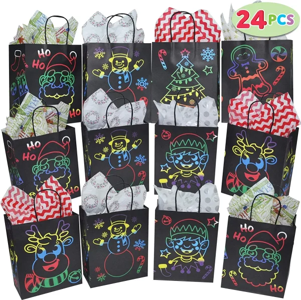 • Kraft paper gift bags with handles includes 24 pcs Christmas-themed scene paper gift bags which come with 8 Christmas-themed designs like Gift Box, Christmas Tree, Snowman, Santa, Penguin, and Polar Bear. Each gift bag measures 10 x 13 x 5 inches.
