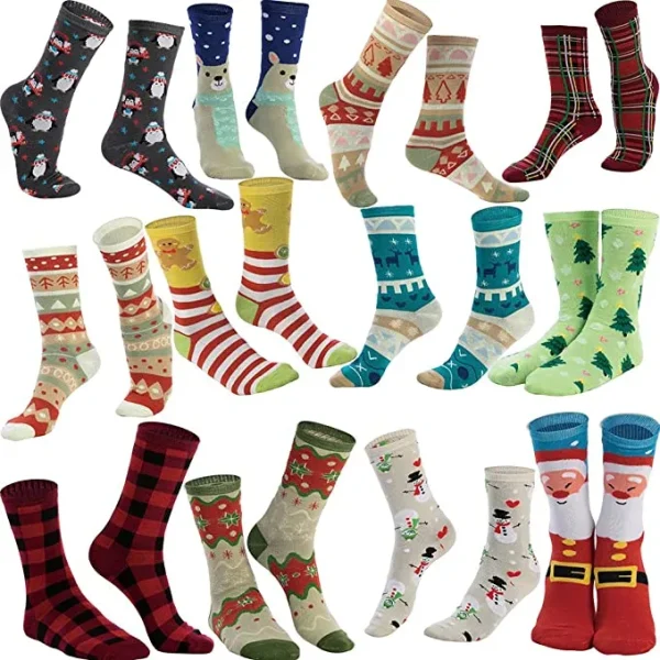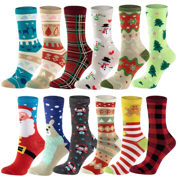 • Holiday Christmas socks come with 12 Pairs of Socks, Printed Fun Colorful Festive, Crew Knee Cozy Socks Women’s Fancy Christmas Holiday Design Soft includes 12 pairs of socks in 12 different vivids and fashionable Christmas graphic designs.