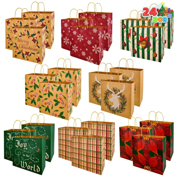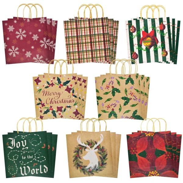 • Our Kraft Paper Gift Bags With Handles set includes 24 pcs Animated Christmas themed Scene paper gift bags which come with 8 Christmas pattern style designs. Each gift bag measures 11x 11 x 5 inches.
