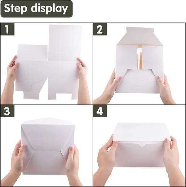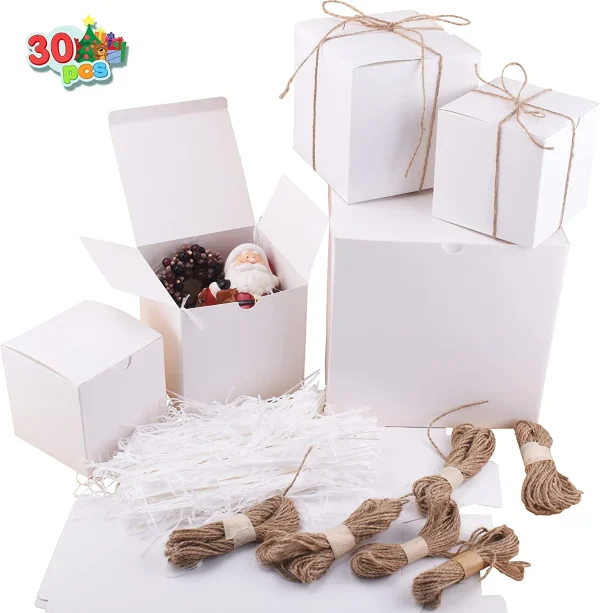• White Christmas gift boxes are composed of 30 pcs boxes with 132-foot long Twine and 0.2 ounces Raffia. The white box set has 3 different sizes such as 8*8*8”, 5*5*5”, and 4*4*4”. Each box size comes with 10 pcs of gift boxes.