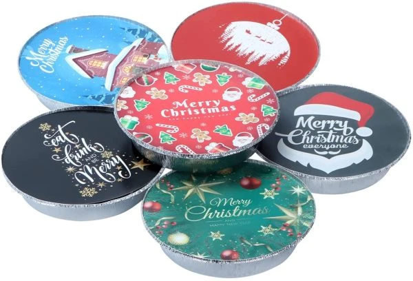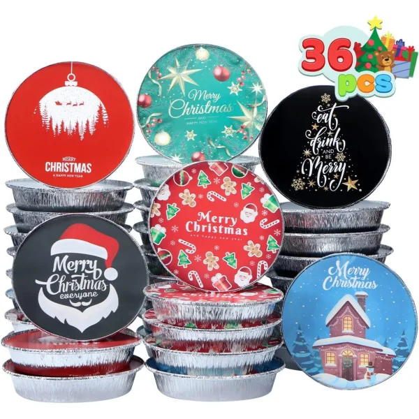 β’ 36 Pcs Aluminum Christmas Cookies Tin Disposable Aluminum Foil Pans. These are made with tin box and aluminum mold paper cover and measure 8.6 x 1.8 inches. This Aluminum Foil Pans comes with 6 paper cover designs.
