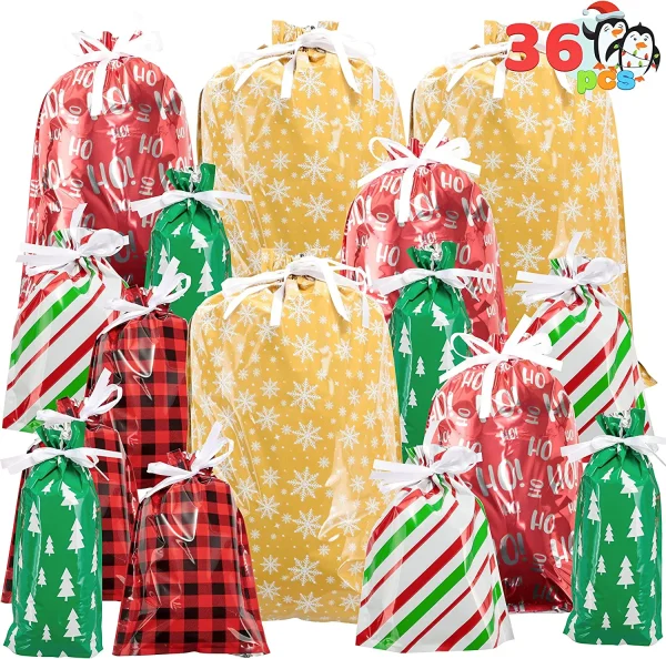 • Drawstring Christmas Bags Set includes 36 Assorted Christmas Gift Bags in Different Designs, 2 designs (12.5″ X 9.4″ inch) 1 design (14.4 X 7 inch), medium size (16.8 X 11.7), large size (22.3 X 16.3 inch ).