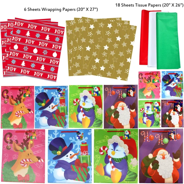 โข Christmas holiday gift bags includes 12 Assorted Sizes Christmas Gift Bags in 4 Different Designs, 6 (20โณ X 27โณ) Pre-cut Wrapping Papers in 3 Designs, and 18 Sheets (20โณ X 26โณ) Tissue Papers in Red, Green, and White.