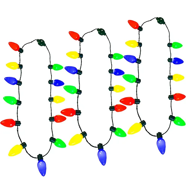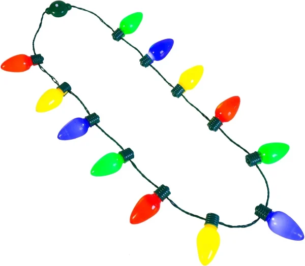 Put on this trendy LED light up Christmas bulb necklace to get into the holiday spirit. Light up your life with this plastic bulb necklace. This festive holiday wearable is traditionally inspired and features 9 multi-color plastic Christmas light bulbs. This fantastic stocking stuffer’s on/off button cycles through 6 different light settings. Each necklace includes a pair of installed and replaceable CR2032 batteries for years of holiday cheer. You can wear this necklace with your favorite holiday outfit for a festive look. It’s also great for any occasion where you need to stand out in the crowd.