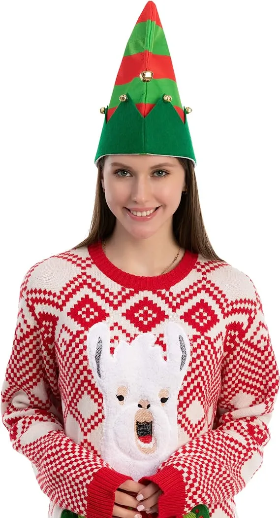 Bring smiles, laughs, and humor to the party with this Christmas elf hat, a perfectly fun and festive costume for holiday parties, Christmas plays, and anyone looking to spread some Christmas cheer. This hat is inspired by the traditional Santa’s helper elf hat. The design features red and green stripes as well as small gold bells. It comes in one size fits all and can be worn by both men and women.