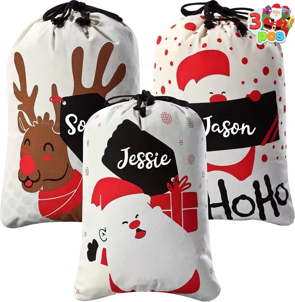 These personalized Christmas burlap drawstring bags, designed to look like Santaβs sacks, will put a big smile on any childβs face this holiday season. Each burlap drawstring bag has a festive reindeer, snowman, and Santa design, as well as a postal stamp that allows you to personalize the sack for your children. Simply write or stitch your childβs name in the designated area with a marker. Either way works perfectly! Includes three Christmas Canvas Drawstring Bags measuring 26Γ19 inches. These are made of polyester cotton. Large enough to accommodate larger or additional gifts. Your children will be overjoyed and excited to see that their gifts have arrived directly from the North Pole!