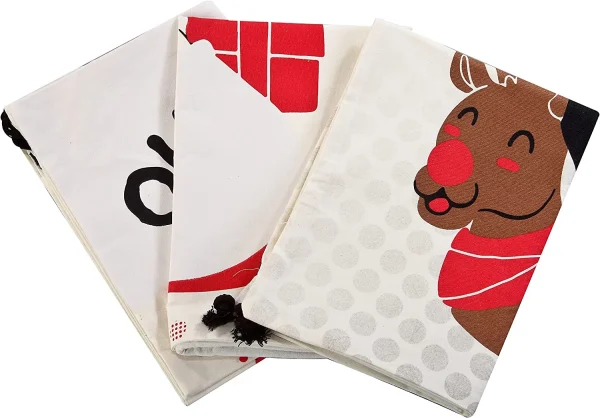 β’ Our burlap bags with drawstring Holiday Party Favor includes 3 pcs Christmas Canvas Drawstring Bags with 3 designs. These are made of polyester cotton material