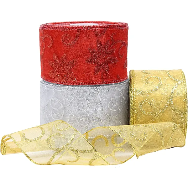 • Each Shiny Shimmer Sheer Organza Holiday Ribbons Measure: 2.75-inches-Wide, Gold 40-Yard-Long, Red and Silver 30-Yard-Long.