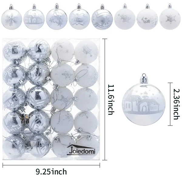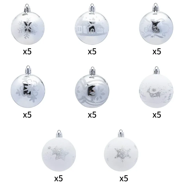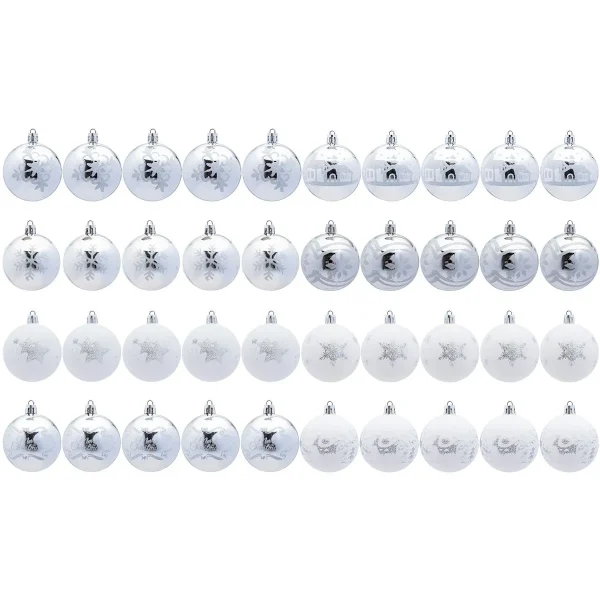 • Our Christmas Balls Ornaments Set includes 40 colored balls. The main colors are Silver and White. Each christmas ball has its own unique print, and there are 6 different designs in total.