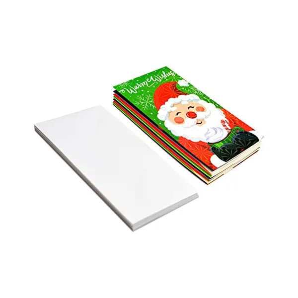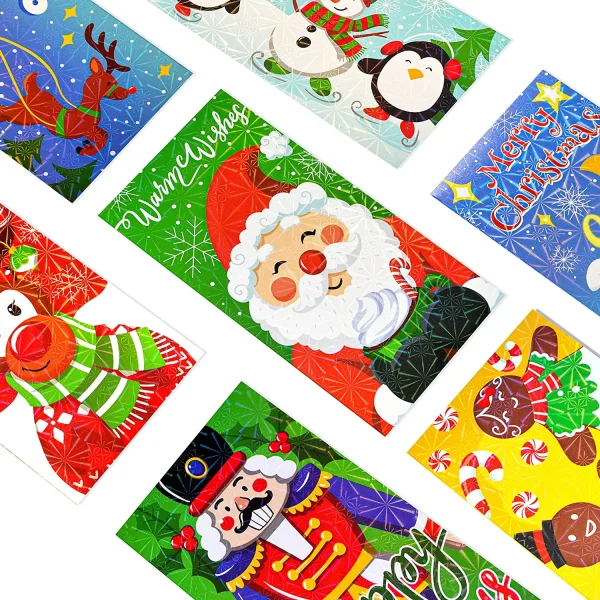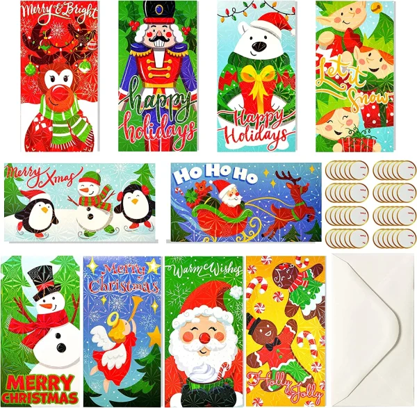 โข Holographic Christmas cards include 40 Pcs Holographic Christmas Style of 10 Designs with To-and-From Stickers. Each Card measures 3.75 x 7.25 inches. 8 Vertical Cards โ Santa, Gingerbread Man, Elves, Nut Cracker, Angel, Polar Bear, Reindeer, Snowman. 2 Horizontal Cards โ Reindeer Sleigh with Santa, Penguins. Can Fit up to 2 Gift Cards or a 20 Dollar Cash.