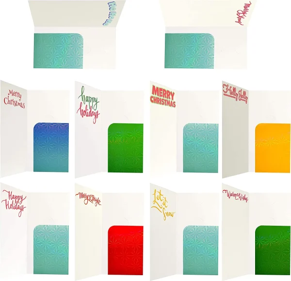 Make your Christmas gifts special and memorable with our Christmas greeting cards. This unique money/gift card holder holds a gift certificate or cash and is available in multiple creative designs to match all tastes, it is the perfect way to add some fun and excitement to a gift! The best Christmas cards for that fun and festive season! The cards are glossy and come with stickers for you to write on the inside of them. Comes in either a vertical or horizontal way. Feel free to fit up to 2 gift cards within our card holder or even a 20-dollar bill if you wish! Holographic Christmas Cards are a fun, new way to share your holiday greetings. These cards will make it easy for your friends and loved ones to see their names on the front, with their messages printed inside.