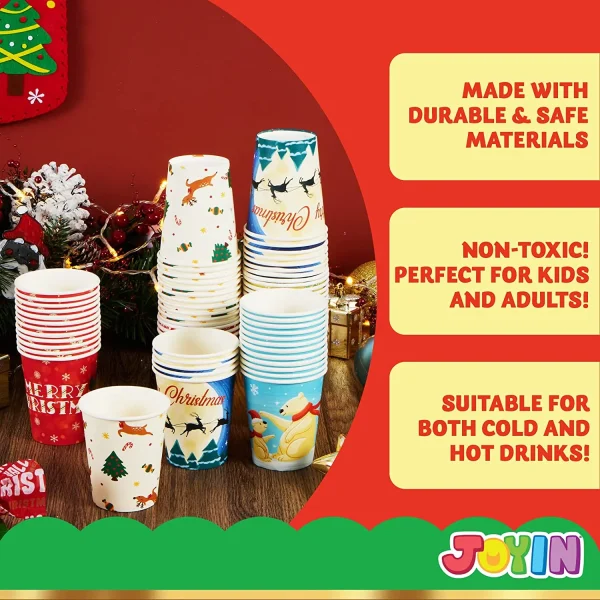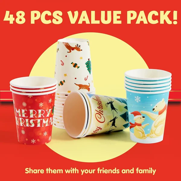 โข Our Christmas Paper Cups Set includes 48 pieces of Christmas paper cups measuring 9 oz in 4 assorted Holiday designs.