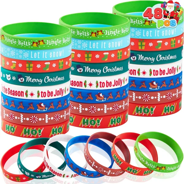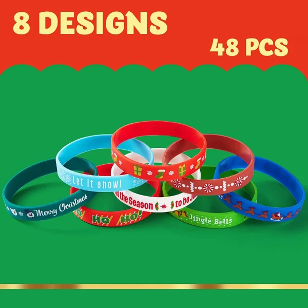 • Rubber band Christmas bracelet includes 48 pcs silicone wristbands featuring 8 different colors & Patterns. The product is made of durable stretchy and flexible materials best for adults, teenagers, and kids.