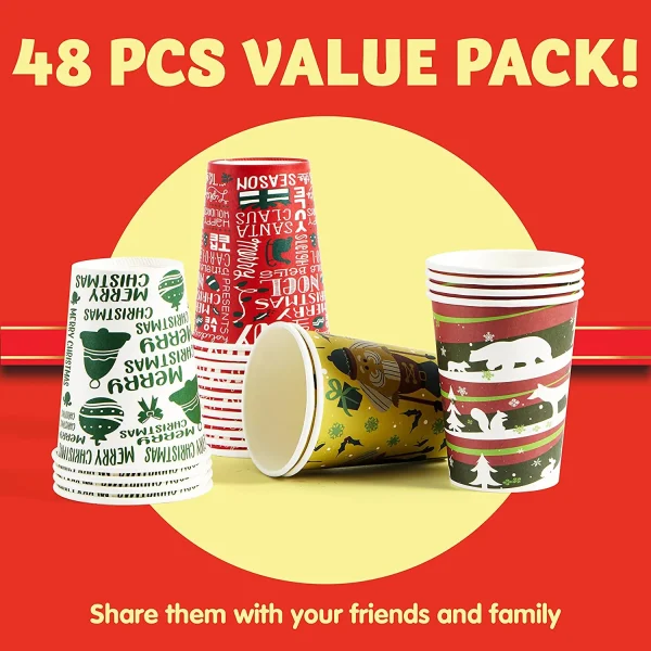 The Christmas disposable cups come in a set of 48 pieces, so they are sufficient enough to satisfy your daily uses and needs on Christmas Day. They are ideal choices for you if you want to entertain your friends at home with a nice cup of hot coffee or tea during the winter months. The pattern design on the cups makes them more attractive, and they can be used as decorations on your table when there is no need to drink or eat from them anymore. The disposable cups are made of food-grade paper material, so they are safe for drinking water; moreover, they are environmentally friendly because of their excellent material quality; therefore, these cups will never break easily even if they are used repeatedly.