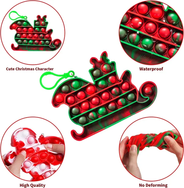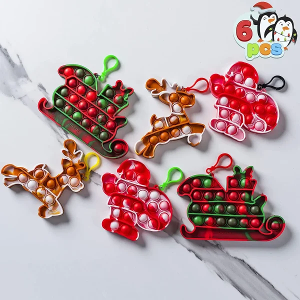 - Our stress reliever toy includes 6 pcs designed toys with 3 designed mixed colored Christmas themed objectives. Each toy measures 5.5 x 6 inches and is paired with colorful keychains.