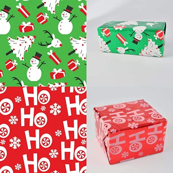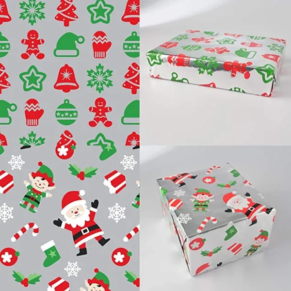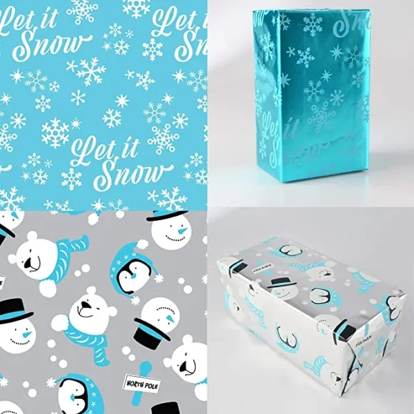 This foil Christmas wrapping paper will be perfect for your upcoming parties. It is packaged in a nice box, so you can store all of the rolls together. Each roll measures 12โณ x 18โณ, and each set contains 6 rolls. Featuring โLet it Snowโ, Polar Bear, Snowman with Christmas Tree, โHo Ho Hoโ, Santa with Elf and Gingerbread Man, these wrapping papers are a fun way to package gifts during the holidays or give them away as gifts themselves! Our Christmas wrapping paper includes 6 rolls of Christmas wrapping paper with cute patterns, including a snowman with a Christmas tree, let it snows, and Ho Ho ho. The material is high quality which is recyclable paper. You can find what you are looking for!