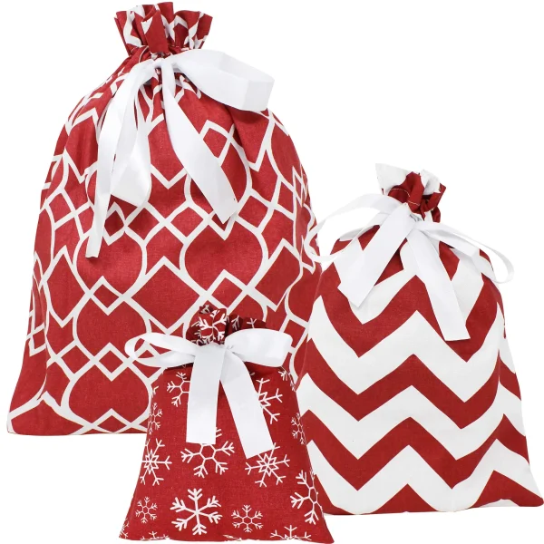 The fabric gift bags are finished with a nice ribbon bow. The ribbon is sewn in place on one side to prevent it from slipping out. Large (16β³ x 20β³) fits several board games, large kitchen items, a laptop, a boot box, or jeans and a cozy sweater. A board game, a collection of kitchen gadgets, and headphones fit in the medium (8β³ x 10β³) size. as well as a shirt or a shoe box Small (10β³x 10β³) fits a book, body product collection, small game, candles, or bath bombs. It is simple to switch to gift bags, and you will have them for many years. They save you money and valuable time during the busy holiday season.