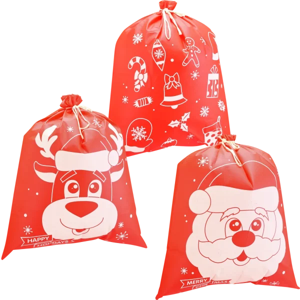 • Giant gift wrap bags comes with 3 classic holiday designs: Santa Claus, a cute reindeer, and Christmas ornaments. They measured 36.22” x 43.30” inches. These red gift sacks feature festive Holiday prints!