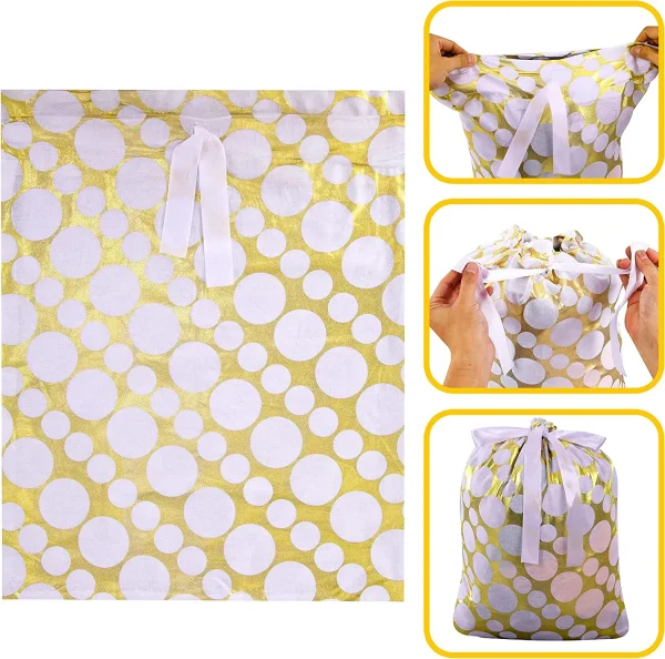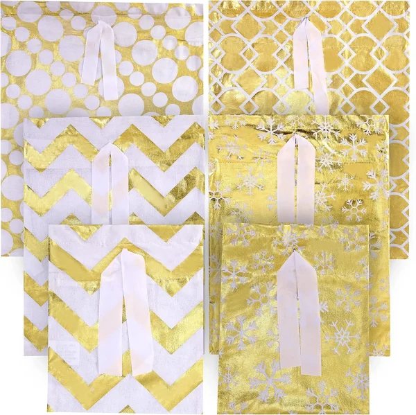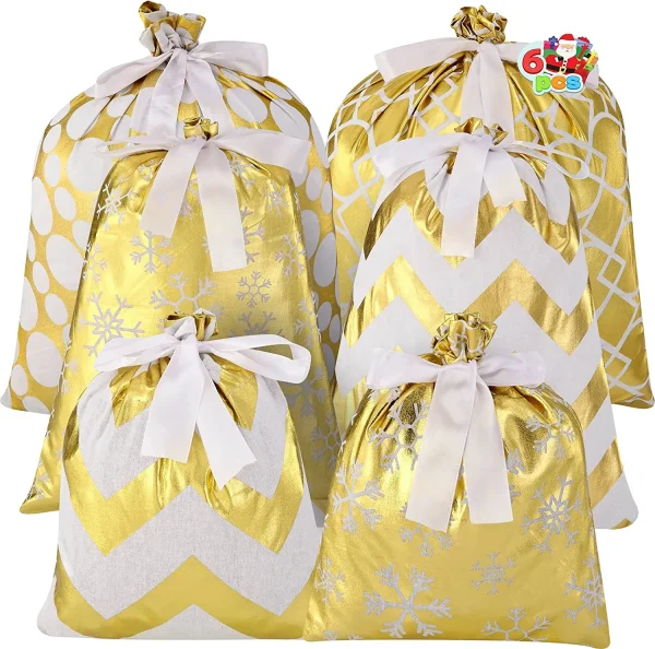 • Gold drawstring gift bags include 6 Pcs Christmas Geometry Golden Fabric Bags with 4 Designs. These come in 3 Sizes Small (10 x 8 inch) Medium (15 x 11 inch) and Large (19 x 16 inch).