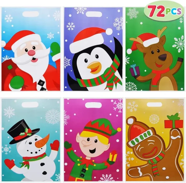 • Christmas Goodie Bags includes 72 pieces of 6 different designs. Each goody bag measures 11″ x 16″ inches. The unique and adorable design includes a Christmas penguin, Santa Claus, a Christmas elf, Mr. reindeer, a snowman, and a gingerbread man!