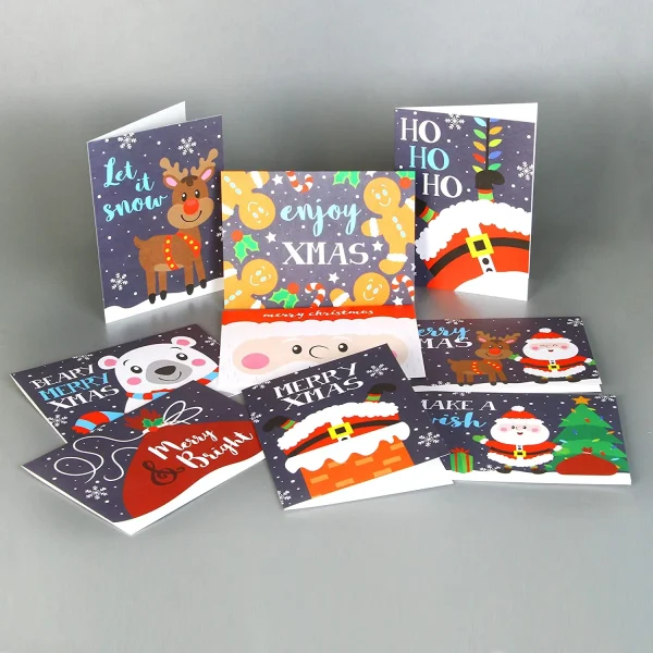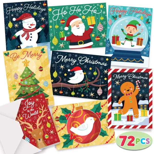 • Christmas greeting cards messages include 72 pieces of 8 different designs. Each card measures 6.24” x 4.62” inches. Designs include Santa, Christmas Tree, Gingerbreadman, and more!