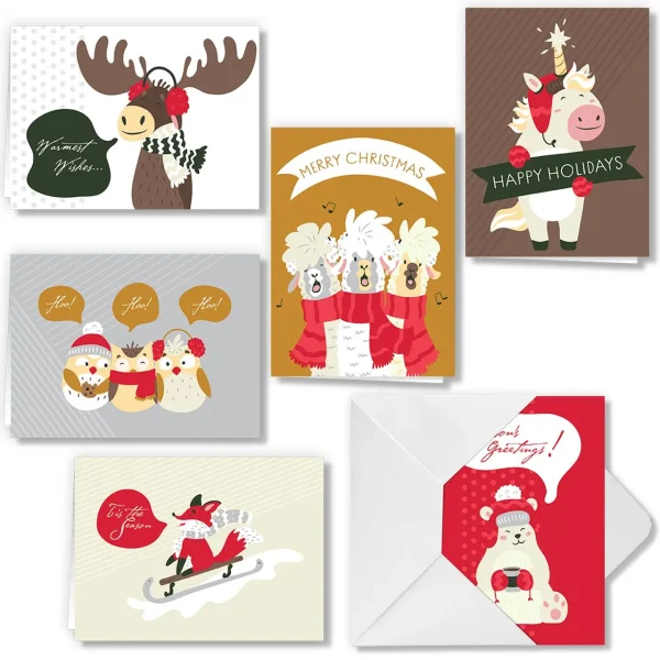 • Cute animal Christmas cards include 72 pieces of 6 different designs. Each card measures 6.24” x 4.62” inches. The artistic designs include a talking reindeer, 3 owls, 3 singing sheep, a unicorn with lights on its horn, a fox on a sleigh ride, and a cute polar bear.