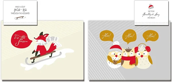 • These fancy cards feature stylish illustrations of cute animals that are sure to tug at the heart of the receiver and the giver. A mixture of sweet animals charm with the warm fuzzy feeling of Christmas. A worthwhile purchase for the holidays!