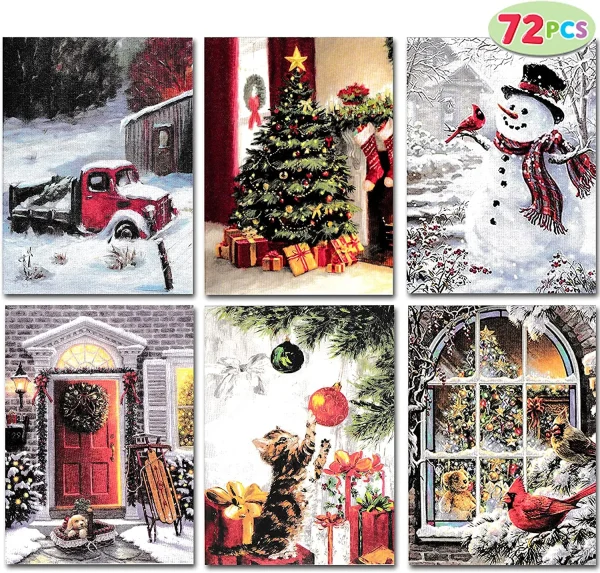 This 72 pieces charming Christmas greeting card has both the hilarious wishes to make loved ones smile and the heartwarming holiday greetings you need. These charming illustrations on these Christmas Cards with Envelopes are likely to touch both the recipientโs and the giverโs heart. a blend of Christmas-themed charming designs. This is certain to put a smile on everyoneโs face every time they open them! You can choose from many different styles like cartoons, cartoon animation, and more! The unique designs are printed on high-quality cardstock that will last for years to come. These charming greeting cards are a perfect way to spread some holiday cheer!