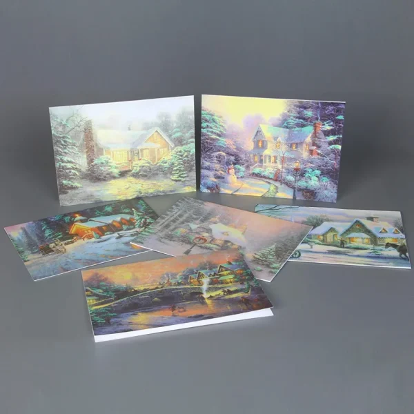 โข Christmas greeting cards include 72 pieces of cards with envelopes in 6 Unique Snowy Houses Festive Designs measuring 6.24โ x 4.62โ inches.