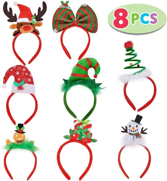 - Our 8 Christmas Headbands with Assorted Design include reindeer, bowknot, Santa hat with holly berry, elf hat, springy Santa hat, gingerbread man, gift box with holly berries and, snowman.