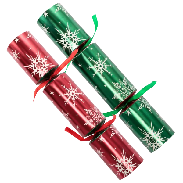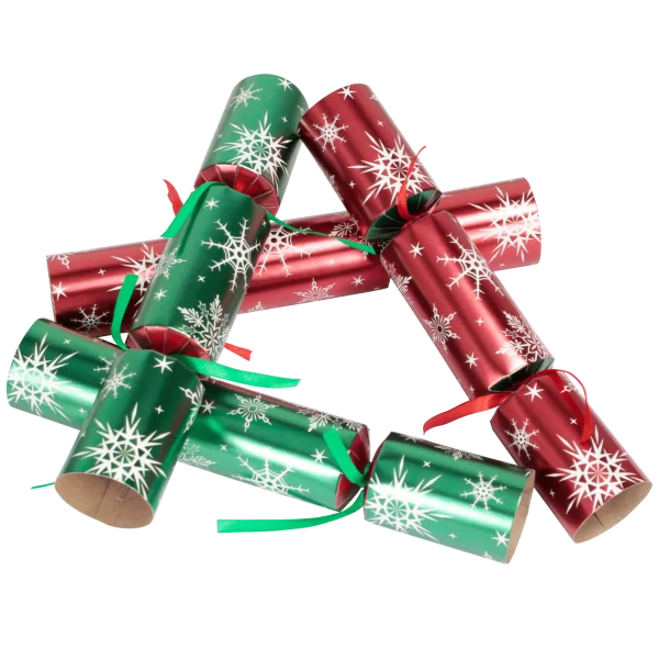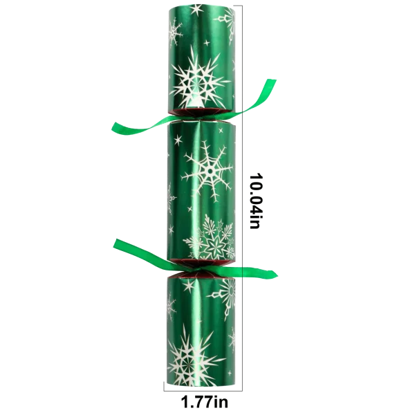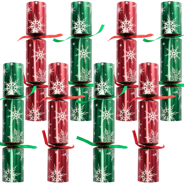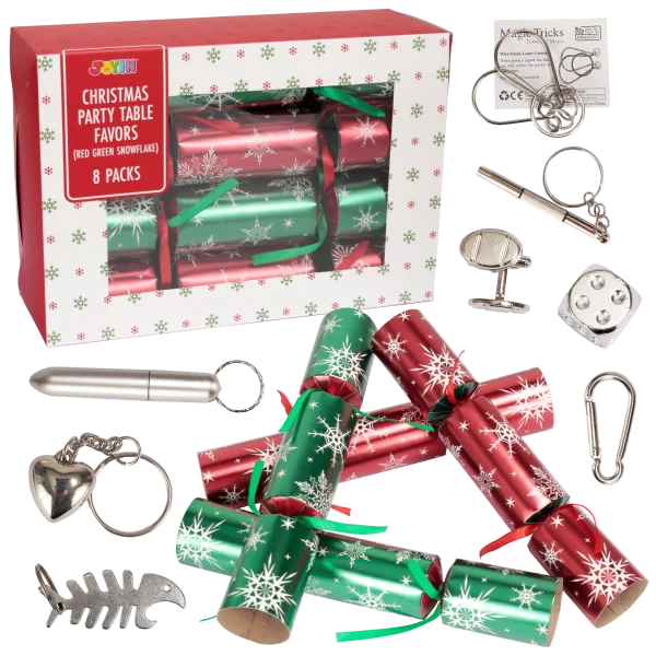 β’ Our Christmas Crackers includes 8 Packs of No Snap Christmas Party Table Favors with Red & Green Snowflake Design. Each party favor contains a party paper hat, a Christmas joke paper, and a random gift inside.