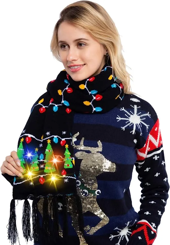 - Our Christmas Lit-up Knitted Scarf can amp up any casual outfit, even add a touch of color to your favorite coat. Looks great with sweaters, cardigans, coats, jackets, tees, tanks, layers and more. Plus it comes with 6 different modes.